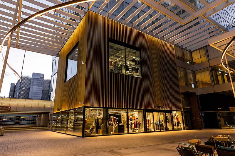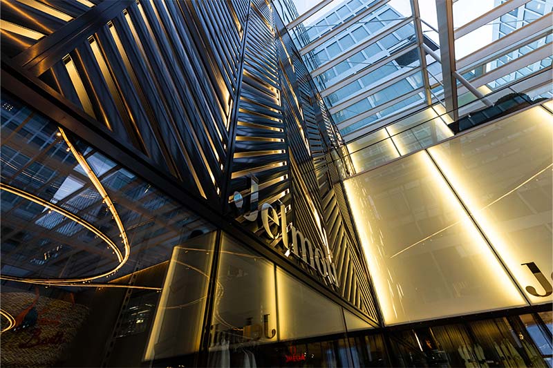 Das Design der beiden Jelmoli Häuser beruht auf dem Zusammenspiel von Materialität, Textur, Transparenz und Reflexion. Um dabei der Differenzierung Ausdruck zu verleihen, wählt Mint Architecture für die Fassaden einen Materialmix aus weissem Glas, Gold-Metall und schwarzen Flächen.