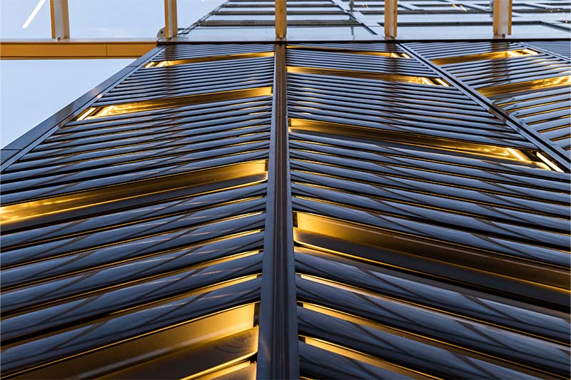 Dank der grossen Erfahrung von se Lightmanagement AG im Bereich der Fassadenbeleuchtung, war es möglich die optimalen Leuchtentypen zu definieren und dieses filigrane und tolle Bauwerk auch in der Nacht sichtbar und spürbar zu machen. Die dunkle Fassade mit teilweise aufgebrochener Fischgrätoptik wirkt mal glänzend, mal matt. Die transluzente, speziell bedruckte Glas-Fassade reflektiert die Umgebung und die goldene Metall-Fassade steht für Performance und Dynamik. In Kombination mit dem Lichtkonzept, das zusammen mit den Lichtspezialisten von Reflexion erarbeitet wurde, ändert sich die Wirkung der drei Fassaden stetig. Je nachdem, ob sie von nah oder fern, bei Tag oder Nacht betrachtet werden.