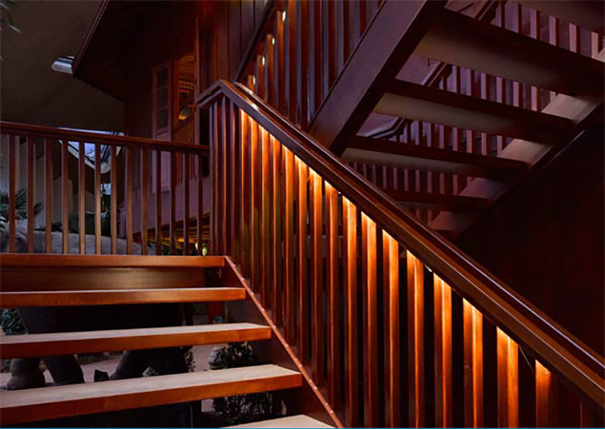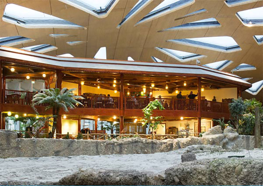 Für die verschiedenen Lichtszenen (z.B. Mondlicht) im Elefantenhaus hat se Lightmanagement 80 LED-Rohrleuchten für die 6’800 Quadratmeter grosse Deckenkonstruktion mit Oberlichtern individuell angefertigt. Mittels eines eigens konfektionierten Steckersystems können die Leuchten vom Personal einfach unterhalten und ausgewechselt werden. Projektspezifisch sind die Rohrleuchten im Farbton der Deckenkonstruktion lackiert und zusätzlich mit einem IP- Schutz gegen Luftfeuchtigkeit und einem Schutz gegen Insekten und Nagetiere ausgerüstet. Der Treppenaufgang zum Eventlokal „Thai-Lodge“ wird durch eine dimmbare und unauffällig verankerte Handlaufleuchte beleuchtet. Im Restaurationsbereich steuert der Mini-Controller adaptolux verschiedene Leuchtmittel für eine wahlweise atmosphärische Beleuchtung oder für klare Sichtverhältnisse.