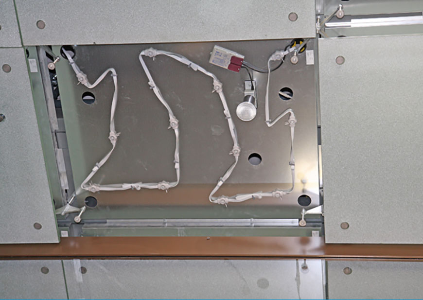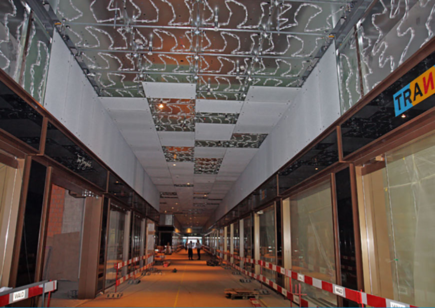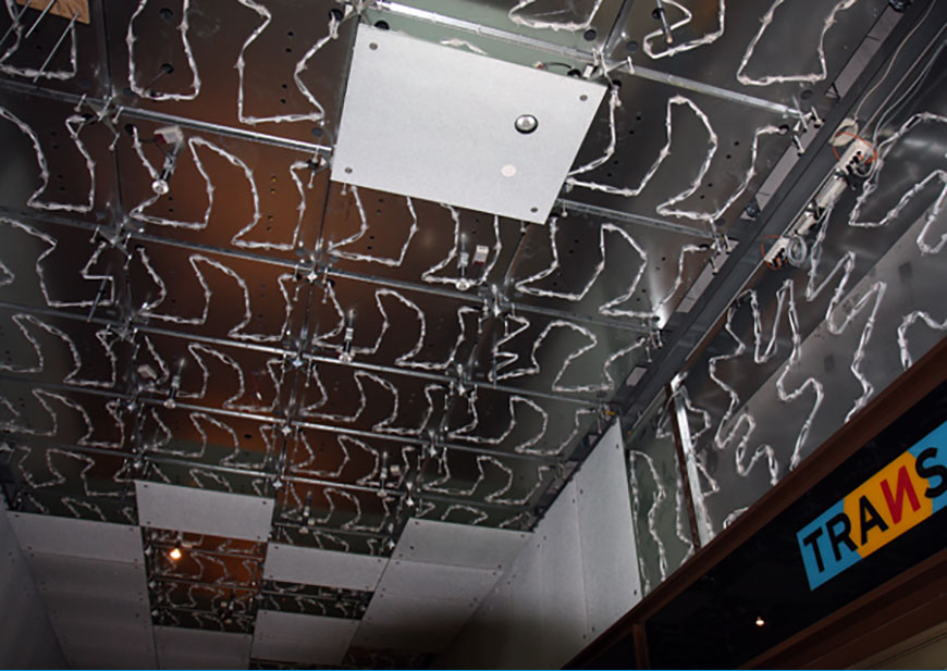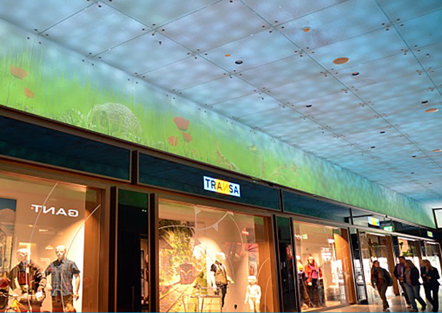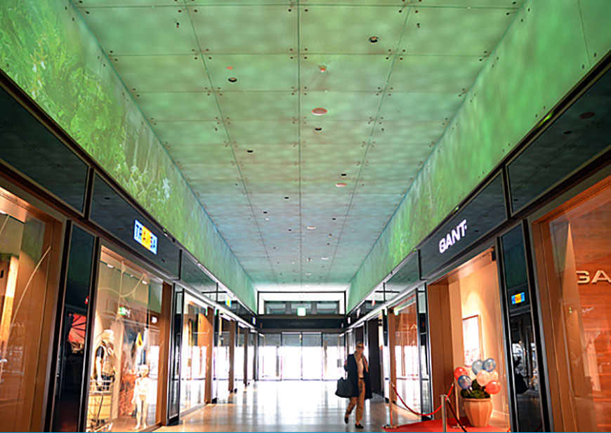 In unmittelbarer Nähe zum Zürcher Hauptbahnhof entstand der neue Stadtteil ‘Europaallee’, der neben der Pädagogischen Hochschule und zahlreichen Wohn- und Bürogebäuden auch eine neue Shopping-Mall herbergt. Dank grosser Projekterfahrung und der guten Zusammenarbeit mit Traxon wurde die se Lightmanagement AG als passender Partner für dieses Projekt ausgewählt. Mit Traxon‘s Dot XL Ketten wurde bereits in einer frühen Projektphase das richtige Produkt gefunden und man konnte so dem Kunden Sicherheit geben, dass die Installation reibungslos verläuft. Für die Europaallee Passage wurden spezielle Dot XL-3 Ketten mit einem 50 cm Abstand angefertigt. „Natur als mediales Motiv im urbanen Raum“ so war das Leitmotiv des Konzeptes, welches beleuchtete Naturmotive und Projektionen mit auditiven Elementen verbindet. Von einer Lighting Control Engine fx (LCE fx) aus gesteuert, setzt sich die mediale Lösung der Passage aus vier Elementen zusammen: Grundbeleuchtung, LED-Decke, Projektionen und Klanginstallationen. In einer Glasdecke mit Glasgranulat-Beschichtung sorgen zahlreiche Downlights für eine angenehme Grundbeleuchtung. In die Decke eingelassene LEDs ermöglichen zusätzlich interessante, sich verändernde Lichtstimmungen und -muster. An mehreren Standorten wird die Decke darüber hinaus mit insgesamt 16 Projektionen medial bespielt. Die Projektionsinhalte stammen aus fünf verschiedenen Bereichen der Natur - Wüste, Alpen, Meer, Regenwald und Wiese - und können saisonal eingesetzt werden. Über diverse punktuelle Klanginstallationen wird der visuelle Eindruck des Besuchers durch synchronisierte, akustische Akzente aus der Natur, wie Meeresrauschen oder Grillenzirpen, ergänzt.